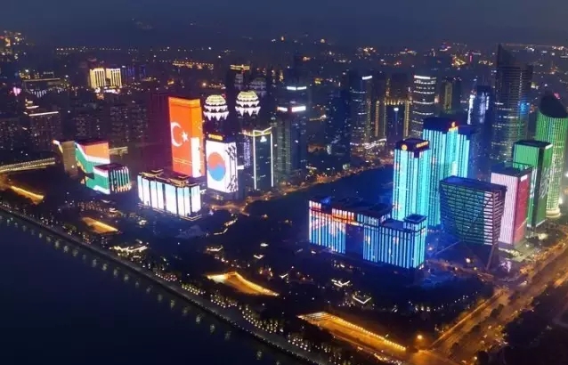 由清華控股成員企業(yè)同方股份實施總體控制的杭州錢江新城核心區(qū)主題燈光秀在G20峰會前正式亮相。該項目在我國首次實現(xiàn)了無線4G對廣域樓宇的同步聯(lián)動控制,將35棟建筑的近70萬盞LED燈組成一幅巨幕,并首次在錯落有致、穿插交錯、多層疊加的建筑組團的建筑立面上,完成動畫制作及播放,動畫演繹在建筑群立面上跑動自如、連接有序、環(huán)繞飄逸,描繪出一幅“錢江夜曲”新畫卷,喜迎G20峰會的八方賓客。
