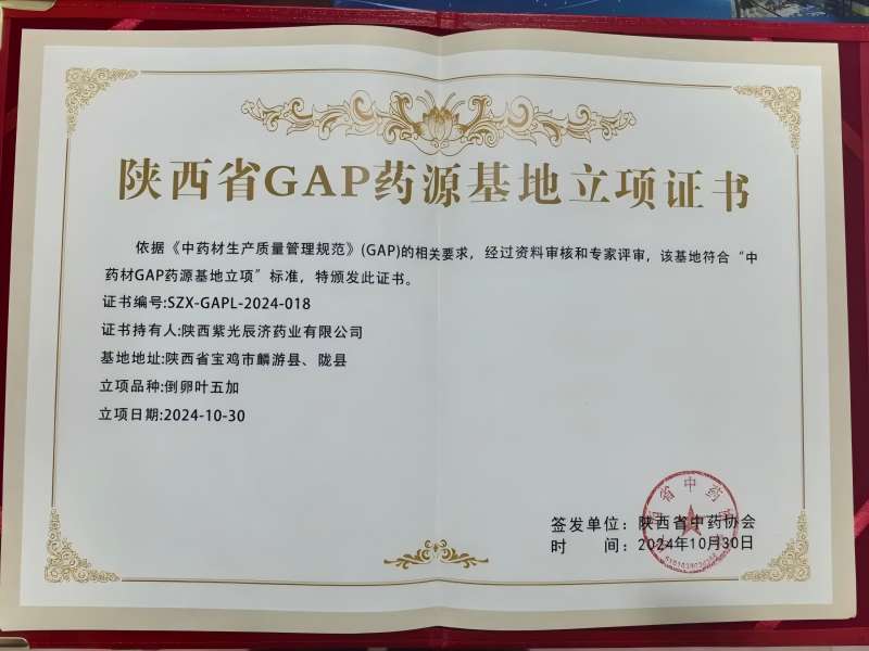 陜西省GAP藥源基地立項(xiàng)證書(shū)