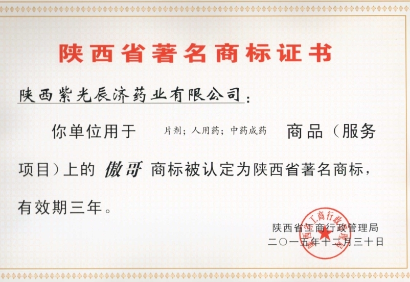 公司繼“辰濟(jì)”牌商標(biāo)獲陜西省著名商標(biāo)稱號后,又傳來喜訊,我公司注冊的“傲哥”商標(biāo)獲得了陜西省著名商標(biāo)及寶雞市知名商標(biāo)榮譽(yù)稱號。 實施商標(biāo)戰(zhàn)略是提升企業(yè)核心競爭力、促進(jìn)企業(yè)做大做強(qiáng)的重要載體,也是企業(yè)轉(zhuǎn)型升級,實現(xiàn)超越的有效途徑。商標(biāo)作為一種無形資產(chǎn)對于企業(yè)的發(fā)展更是管理價值的有效提升。公司于2000年取得了“傲哥”牌商標(biāo)的注冊證,開發(fā)了傲哥品牌。為樹立品牌形象,經(jīng)過近六十年的努力,公司走出一條屬于自己的品牌興企之路。 近年來,隨著公司的快速發(fā)展,在增強(qiáng)自身實力的同時,紫光辰濟(jì)藥業(yè)始終把實施商標(biāo)戰(zhàn)略,提升企業(yè)核心競爭力作為快速發(fā)展的著力點(diǎn),加快了企業(yè)自主知識產(chǎn)權(quán)和品牌的建設(shè)的步伐,建立了商標(biāo)發(fā)展規(guī)劃,明確了工作思路,進(jìn)一步強(qiáng)化了工作措施,注重發(fā)揮商標(biāo)在市場競爭中的作用,經(jīng)過對“辰濟(jì)”“傲哥”等品牌的大力宣傳和產(chǎn)品銷售,公司榮獲了“陜西省著名商標(biāo)”、“寶雞市著名商標(biāo)”“寶雞市知名商標(biāo)”等多項榮譽(yù)稱號,為公司品牌發(fā)展戰(zhàn)略提供了有力保障。