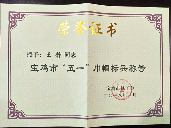 黨總支副書記、團(tuán)委書記王靜同志榮獲寶雞市“五一”巾幗標(biāo)兵獎 |