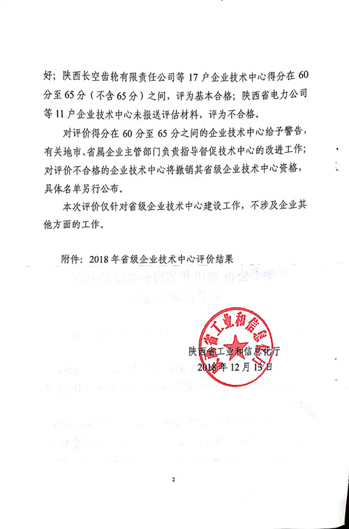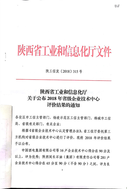 根據(jù)陜工信發(fā)[2018]315號文件《陜西省工業(yè)和信息化廳關于公布2018年省級企業(yè)技術中心評價結果的通知》,我司在此次評價中取得83.64分的喜人成績。
