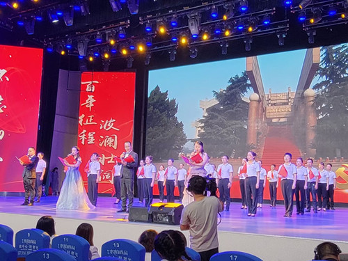 隨后全體黨員、積極分子共同上臺慶祝中國共產(chǎn)黨100周年,激情盎然表演了配樂詩朗誦《南湖的紅船,讓理想啟航》。