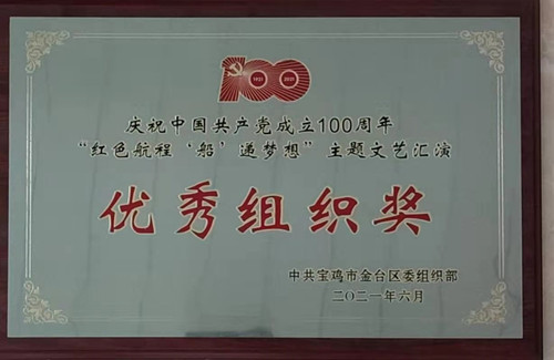 為慶祝中國共產(chǎn)黨建黨100周年,陜西紫光辰濟(jì)藥業(yè)有限公司全體黨員于2021年6月30日參加金臺區(qū)非公和社會組織系統(tǒng)慶祝中國共產(chǎn)黨成立100周年“紅色航程‘船’遞夢想”主題文藝匯演暨“兩優(yōu)一先”表彰大會。 文藝演出中,公司黨員集體表演配樂詩朗誦《南湖的紅船,讓理想啟航》,并獲得由中共寶雞金臺區(qū)委組織部頒發(fā)的“優(yōu)秀組織獎”。