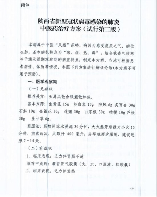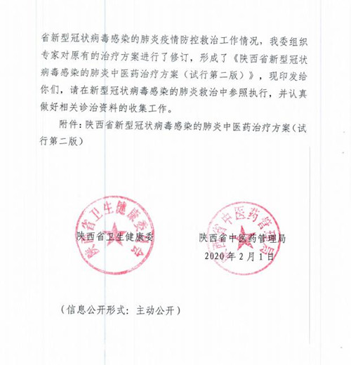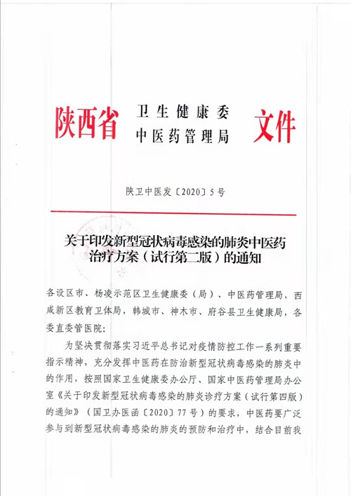 2020年2月1日,陜西省衛(wèi)健委、陜西省中醫(yī)藥管理局發(fā)布了《關(guān)于印發(fā)新型冠狀病毒感染的肺炎中醫(yī)藥治療方案(試行第二版)的通知》。