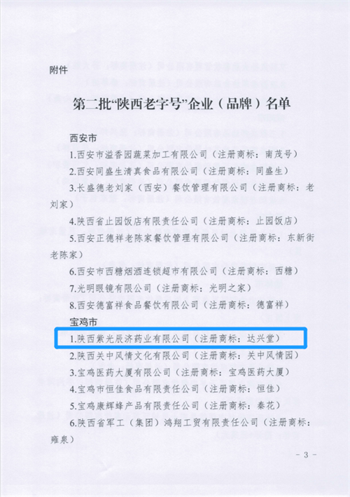 喜報(bào)!陜西紫光辰濟(jì)藥業(yè)有限公司“達(dá)興堂”企業(yè)(品牌)榮獲“陜西老字號(hào)” |
