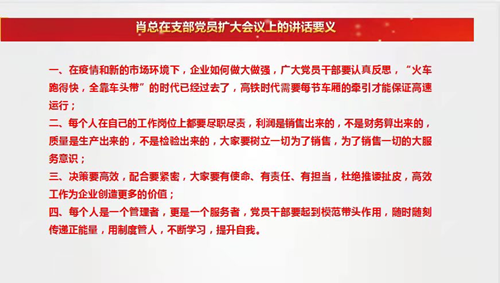 新冠疫情已經(jīng)歷了三年多,市場(chǎng)環(huán)境也發(fā)生了深刻變化,如何探索在“黨員干部如何在疫情和新形勢(shì)下?lián)?dāng)有為”,紫光辰濟(jì)藥業(yè)黨支部于5月13日下午在公司黨建活動(dòng)室召開(kāi)了支部黨員干部擴(kuò)大會(huì)議。 會(huì)議由公司支部書(shū)記王靜主持,王靜書(shū)記首先傳達(dá)了市委市政府近期召開(kāi)的“百人幫百企”會(huì)議精神,號(hào)召黨員干部以此精神為動(dòng)力,開(kāi)展公司內(nèi)部“人人幫企業(yè)”的活動(dòng),克服疫情帶來(lái)的不利影響,盡自己最大可能解決公司面臨的各種困難,保障生產(chǎn)經(jīng)營(yíng)活動(dòng)正常進(jìn)行。 公司紀(jì)檢委員張建華也傳達(dá)了集團(tuán)黨委《關(guān)于疫情期間做好思想政治宣傳工作的通知》、《關(guān)于建立日常監(jiān)督工作月報(bào)制度的通知》等文件精神,并對(duì)公司在3月疫情期間黨員干部堅(jiān)守崗位,保工保產(chǎn),社區(qū)志愿,防疫藥品志愿等事跡進(jìn)行了通報(bào)。 會(huì)議最后肖紅星書(shū)記做了重要講話。在講話中從四個(gè)方面對(duì)疫情和當(dāng)前形勢(shì)做了重要闡述。一是廣大黨員干部要認(rèn)真反思,“火車跑得快,全靠車頭帶”的時(shí)代已經(jīng)過(guò)去了,高鐵時(shí)代需要每節(jié)車廂的牽引才能保證高速運(yùn)行;二是每個(gè)人在自己的工作崗位上都要盡職盡責(zé),利潤(rùn)是銷售出來(lái)的,不是財(cái)務(wù)算出來(lái)的,質(zhì)量是生產(chǎn)出來(lái)的,不是檢驗(yàn)出來(lái)的,大家要樹(shù)立一切為了銷售,為了銷售一切的大服務(wù)意識(shí);三是決策要高效,配合要緊密,大家要有使命、有責(zé)任、有擔(dān)當(dāng),杜絕推諉扯皮,高效工作為企業(yè)創(chuàng)造更多的價(jià)值;四是每個(gè)人是一個(gè)管理者,更是一個(gè)服務(wù)者,黨員干部要起到模范帶頭作用,隨時(shí)隨刻傳遞正能量,用制度管人,不斷學(xué)習(xí),提升自我。 王靜書(shū)記要求公司黨員干部要認(rèn)真學(xué)習(xí)肖書(shū)記的講話精神,立足本職崗位,扎實(shí)做好本部門(mén)工作的同時(shí)加強(qiáng)與其他部門(mén)的協(xié)調(diào)配合,在疫情面前不氣餒,帶領(lǐng)本部門(mén)和全體員工為企業(yè)發(fā)展做出應(yīng)有的貢獻(xiàn)。