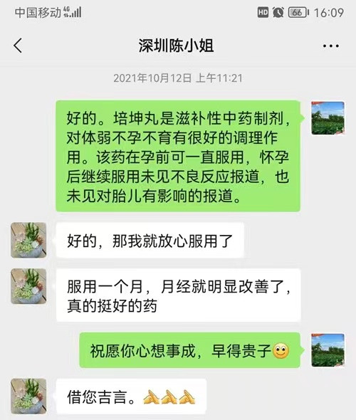 一起產(chǎn)品質(zhì)量投訴終于圓滿解決,隨著時(shí)間的飛逝,這起事件也逐漸淡出了汪總工的記憶。 時(shí)間過(guò)得飛快,一晃一年多過(guò)去了。2022年12月11日,汪總工突然收到陳女士一則短信:冒昧打擾了,向您報(bào)個(gè)喜,我順利懷孕生子,寶寶今天滿月了!很感謝你們,也很感謝你們的良心好藥!……汪總工聽(tīng)后十分欣慰,他向陳女士道賀的同時(shí),也將這個(gè)喜訊及時(shí)向科室的同事們作了通告。大家為既為陳女士高興,也嘖嘖稱贊培坤丸的神奇療效。