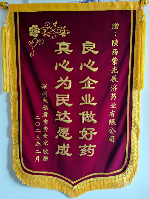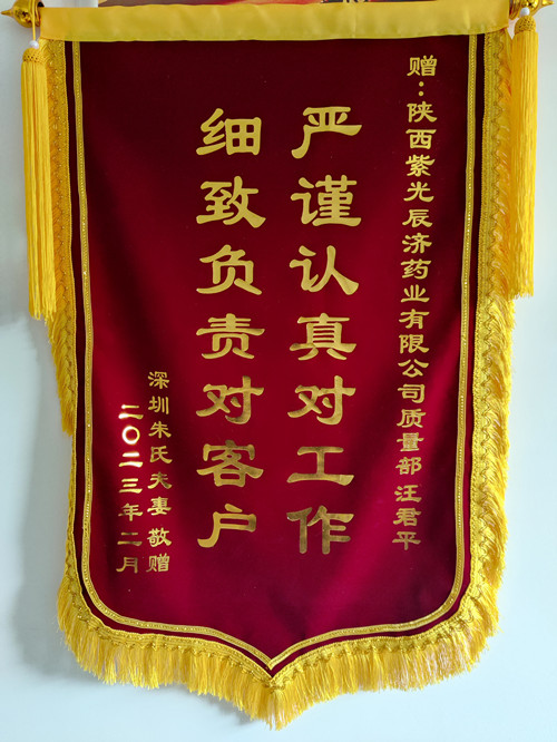 2023年元宵節(jié)剛過(guò),正在忙碌上班的汪總工再次接到了陳女士的信息:汪部長(zhǎng),很不好意思,寶寶滿月那天就想做面錦旗送給你們,以表達(dá)我們的感恩之情,但因后來(lái)一段時(shí)間深圳疫情嚴(yán)重,我們一家全陽(yáng)了,忙于治療和修養(yǎng),時(shí)間耽誤了。剛一過(guò)年我們就制作了錦旗,今天快遞已送到貴公司門衛(wèi)處,請(qǐng)查收。 打開(kāi)包裝精美的長(zhǎng)條型方盒,展開(kāi)兩面燙著金字的旌旗,一方系贈(zèng)陜西紫光辰濟(jì)藥業(yè)有限公司:“良心企業(yè)做好藥,真心為民達(dá)愿成”;另一方贈(zèng)技術(shù)總工汪君平:“嚴(yán)謹(jǐn)認(rèn)真對(duì)工作,細(xì)致負(fù)責(zé)對(duì)客戶”。醫(yī)者仁心,看著金光閃耀的錦旗,汪總工眼眶有些潤(rùn)濕了。金杯銀杯不及老百姓的口碑,這錦旗不僅是對(duì)培坤丸療效的肯定,更是對(duì)紫光辰濟(jì)這個(gè)百年老字號(hào)藥企的認(rèn)同和贊譽(yù)?。? 盡小者大,慎微者著,百年來(lái)紫光辰濟(jì)人腳踏實(shí)地,守牢質(zhì)量底線,用工匠精神堅(jiān)持做好藥,為人民,以療效確切的產(chǎn)品贏得了消費(fèi)者的良好口碑;未來(lái)發(fā)展之路上,紫光辰濟(jì)將繼續(xù)做好藥品生產(chǎn),充分發(fā)揮中醫(yī)藥的獨(dú)特優(yōu)勢(shì)與作用,守正創(chuàng)新,不斷進(jìn)取,為人民健康提供堅(jiān)實(shí)的保障。