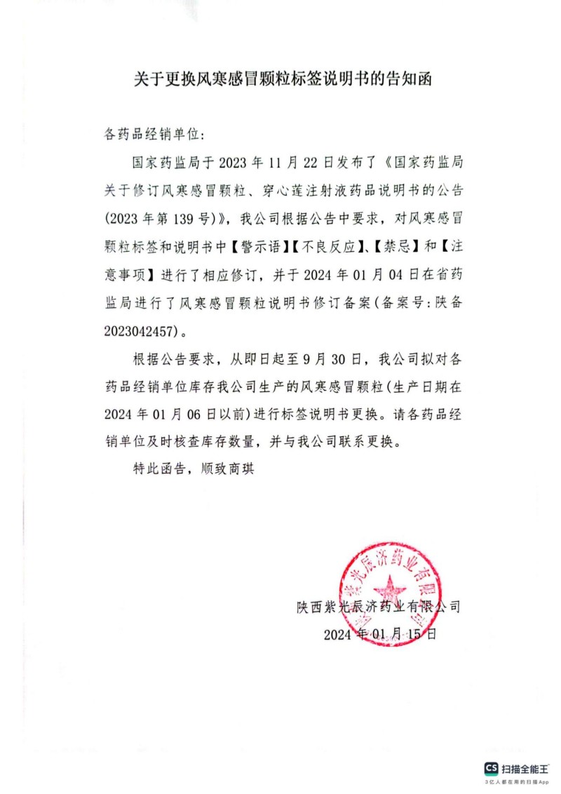 關(guān)于更換風(fēng)寒感冒顆粒標(biāo)簽說(shuō)明書(shū)的告知函 |
